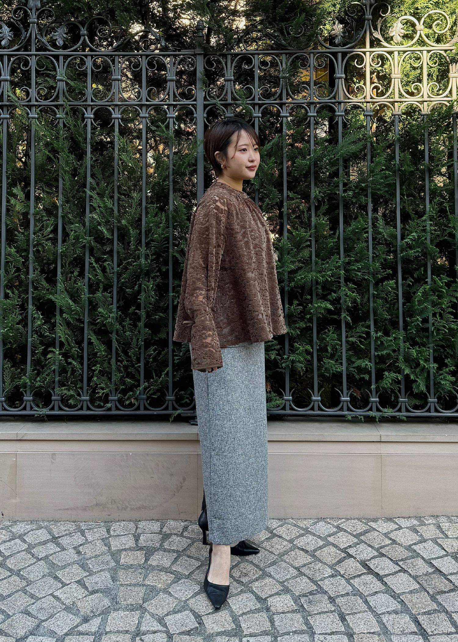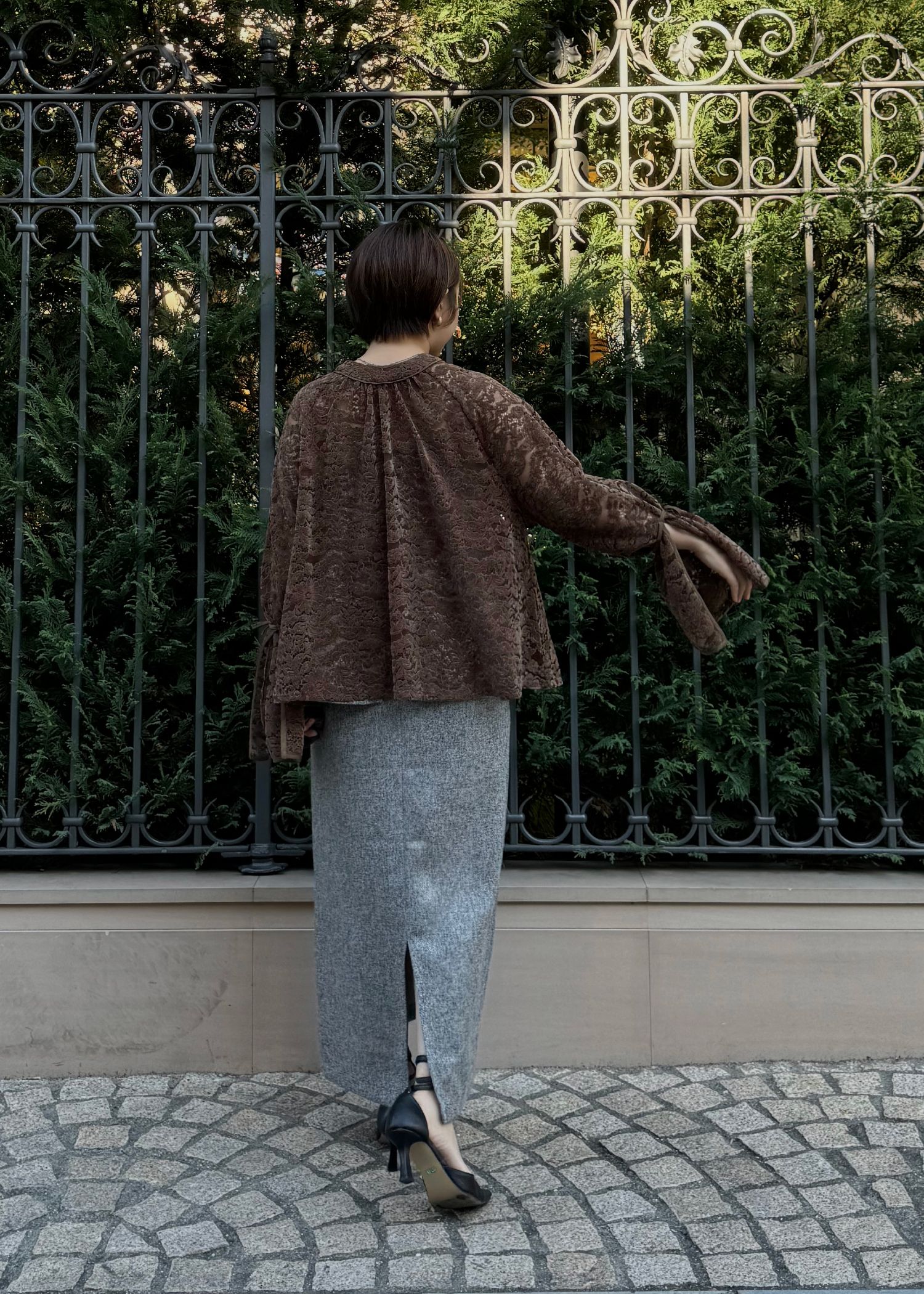 sheer velour lace ribbon sleeve blouse