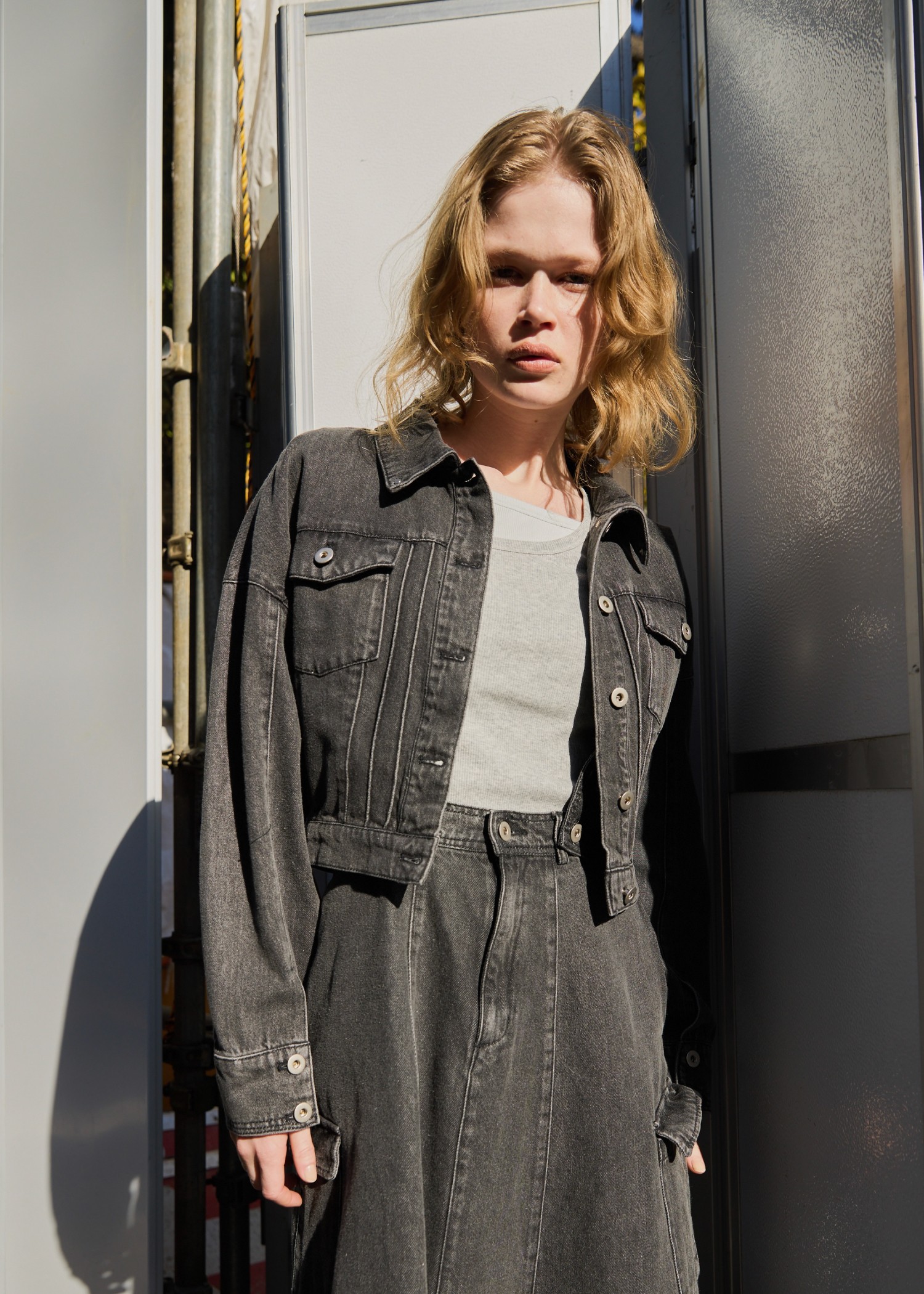 short denim bi color stitch JK