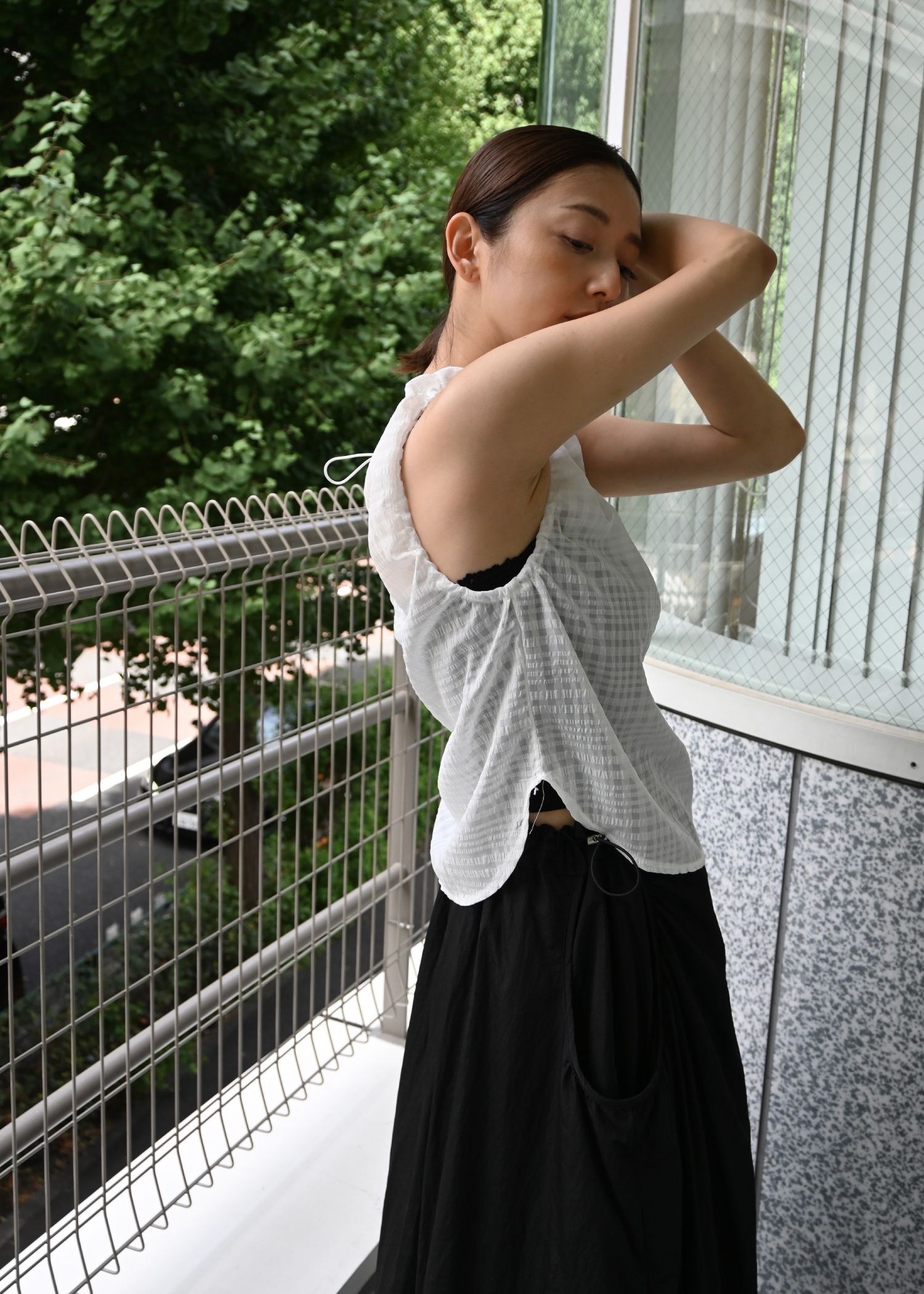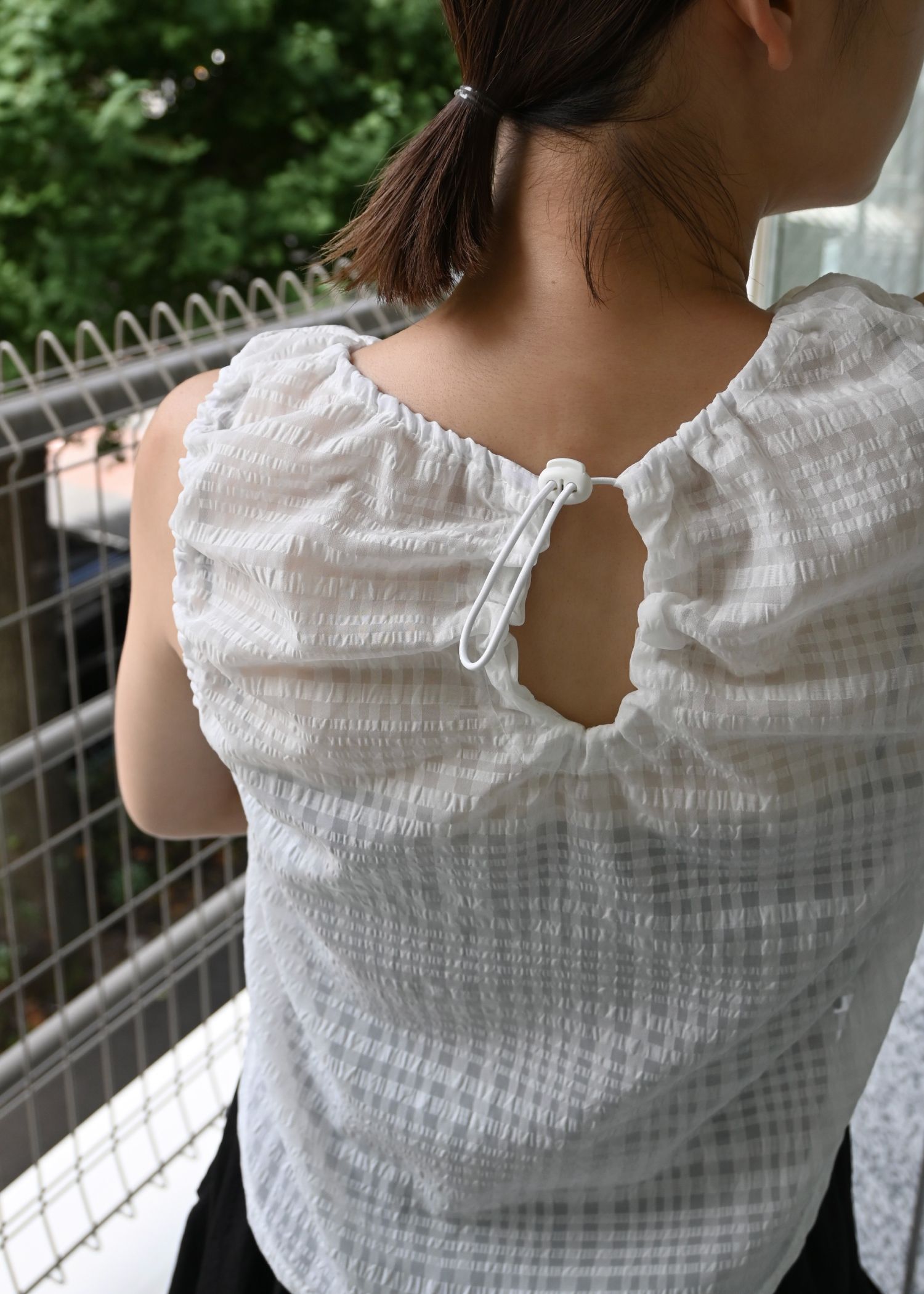 sheer check drawstring no sleeve tops