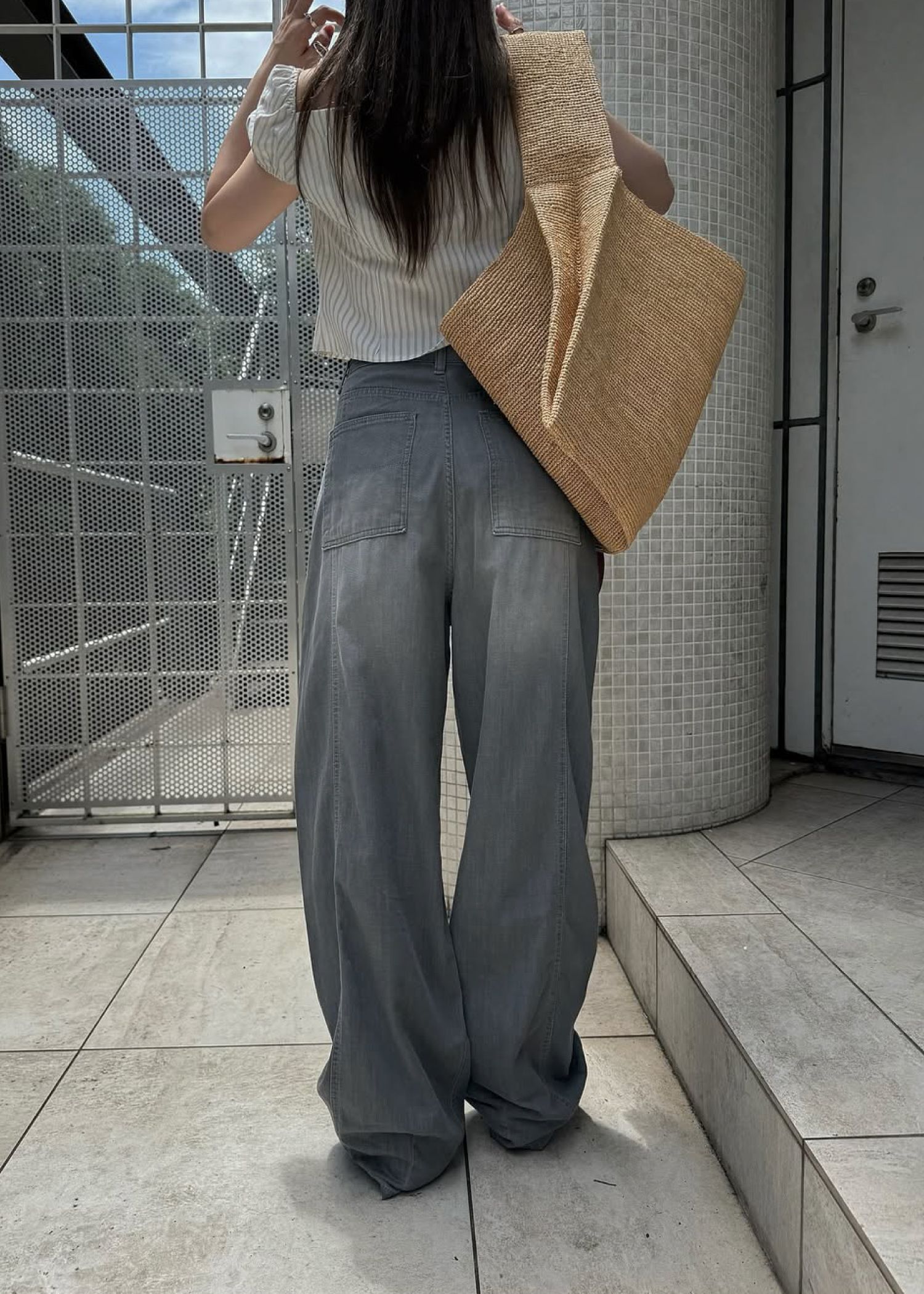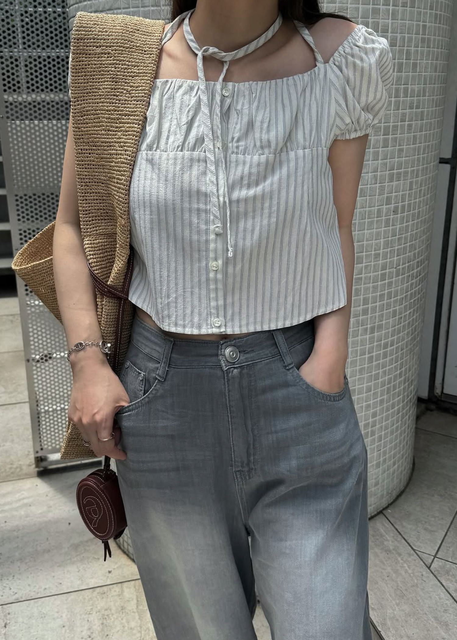 stripe gather puff sleeve BL