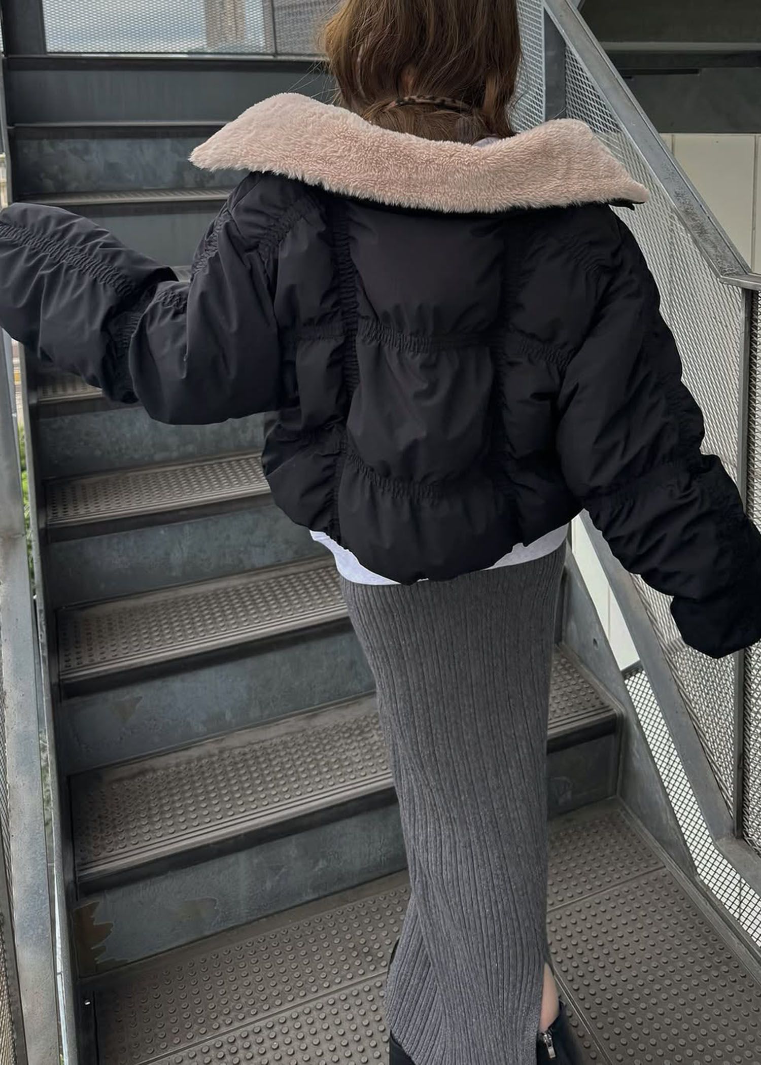 down stitch check fur collar short JK