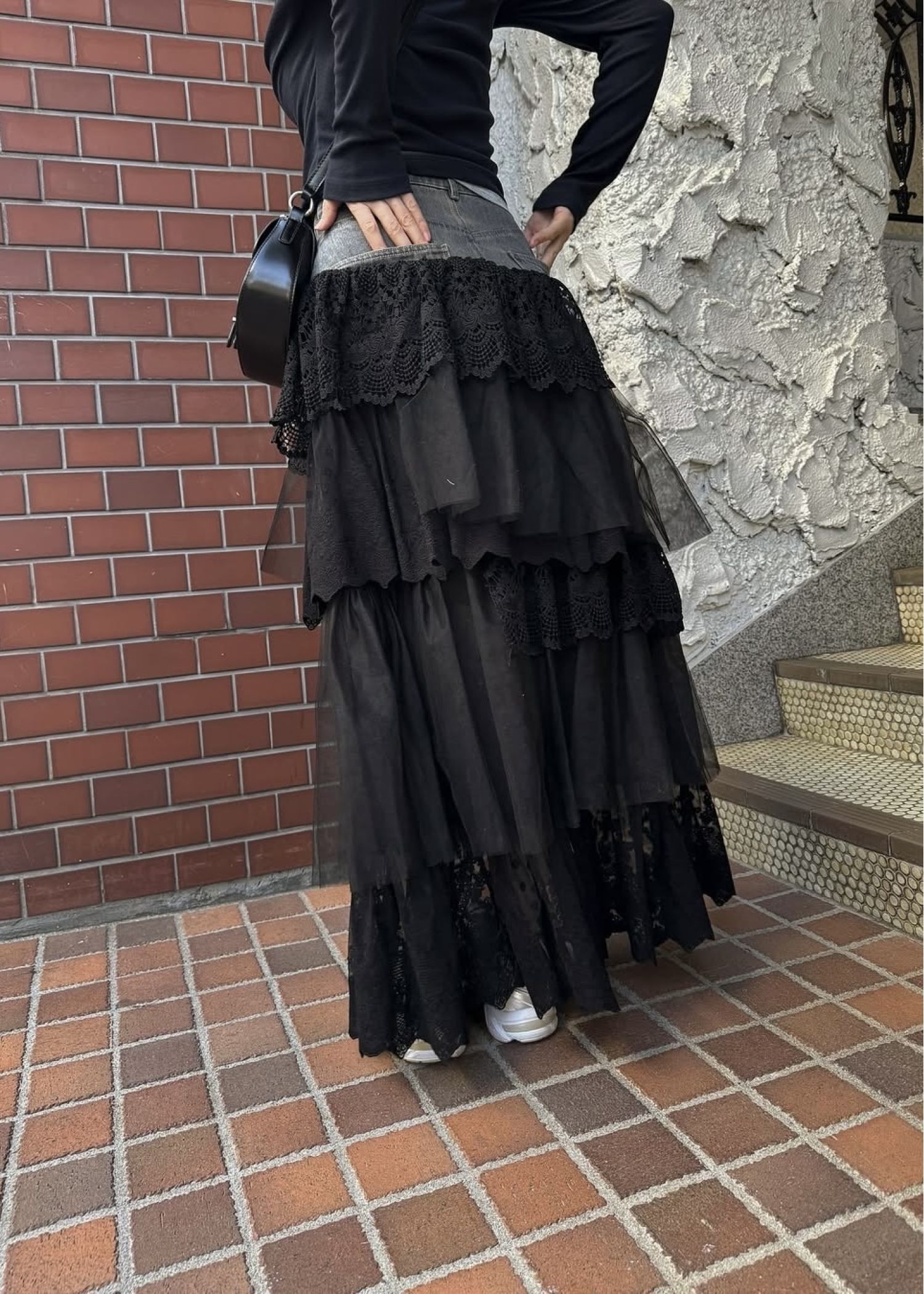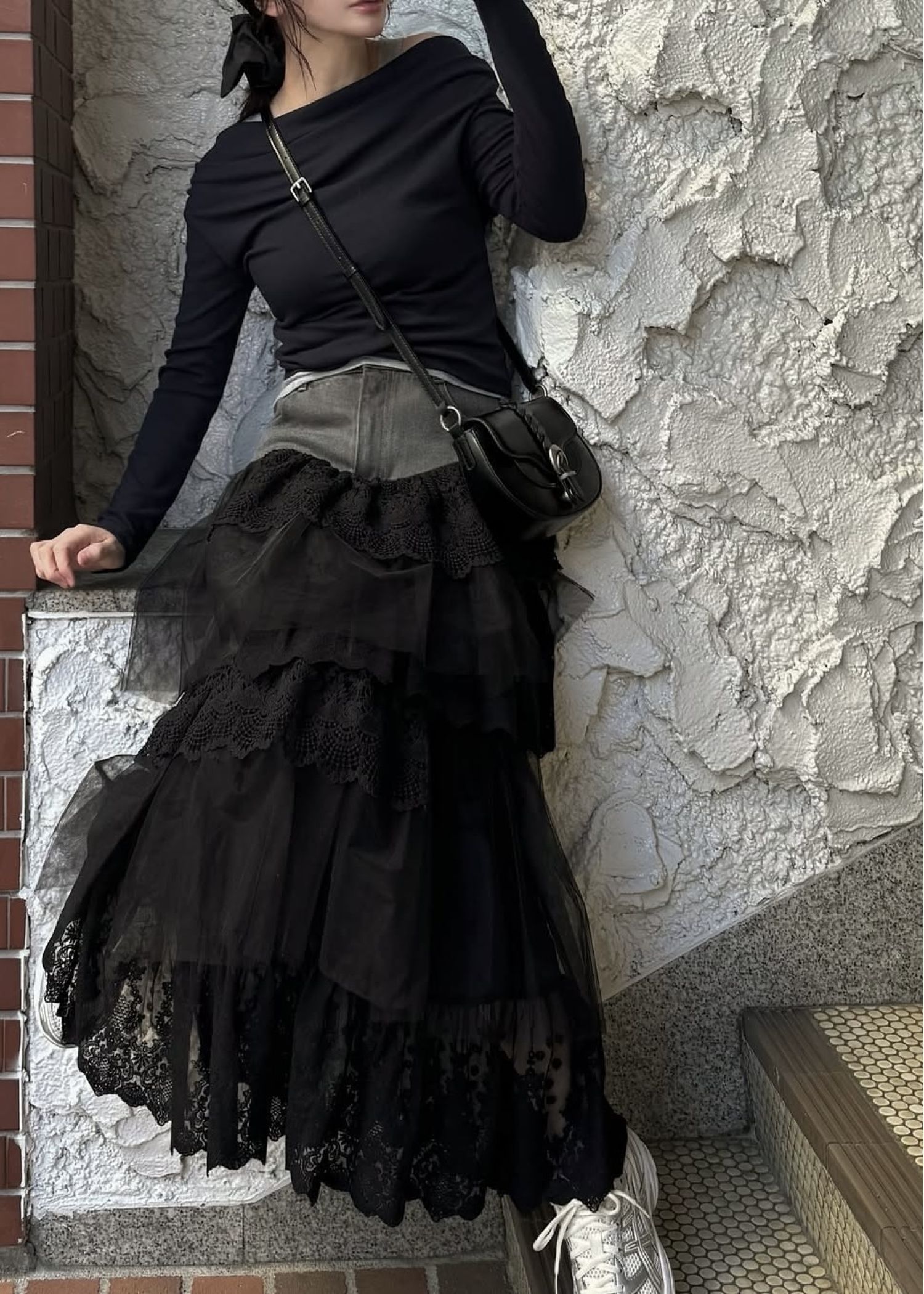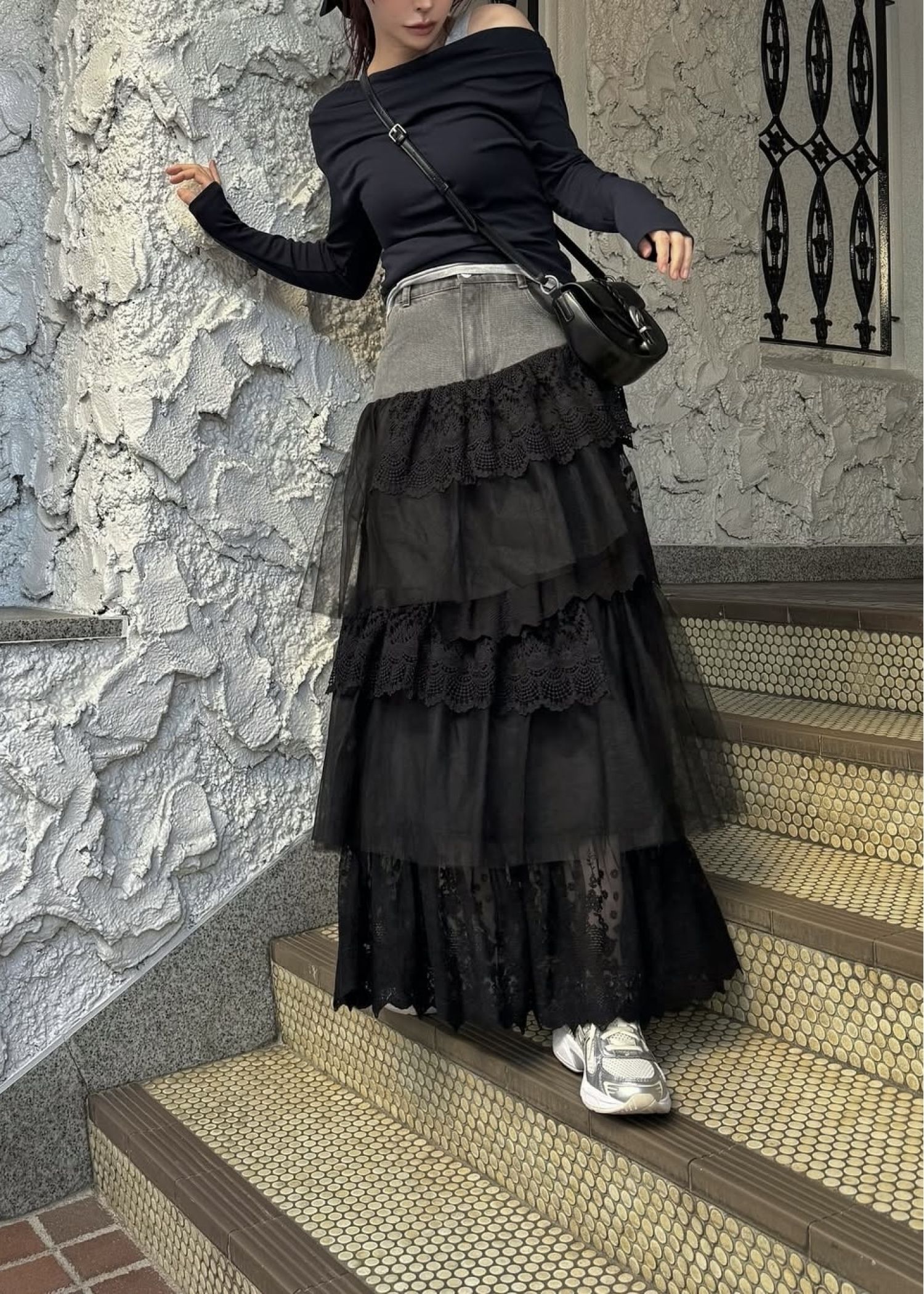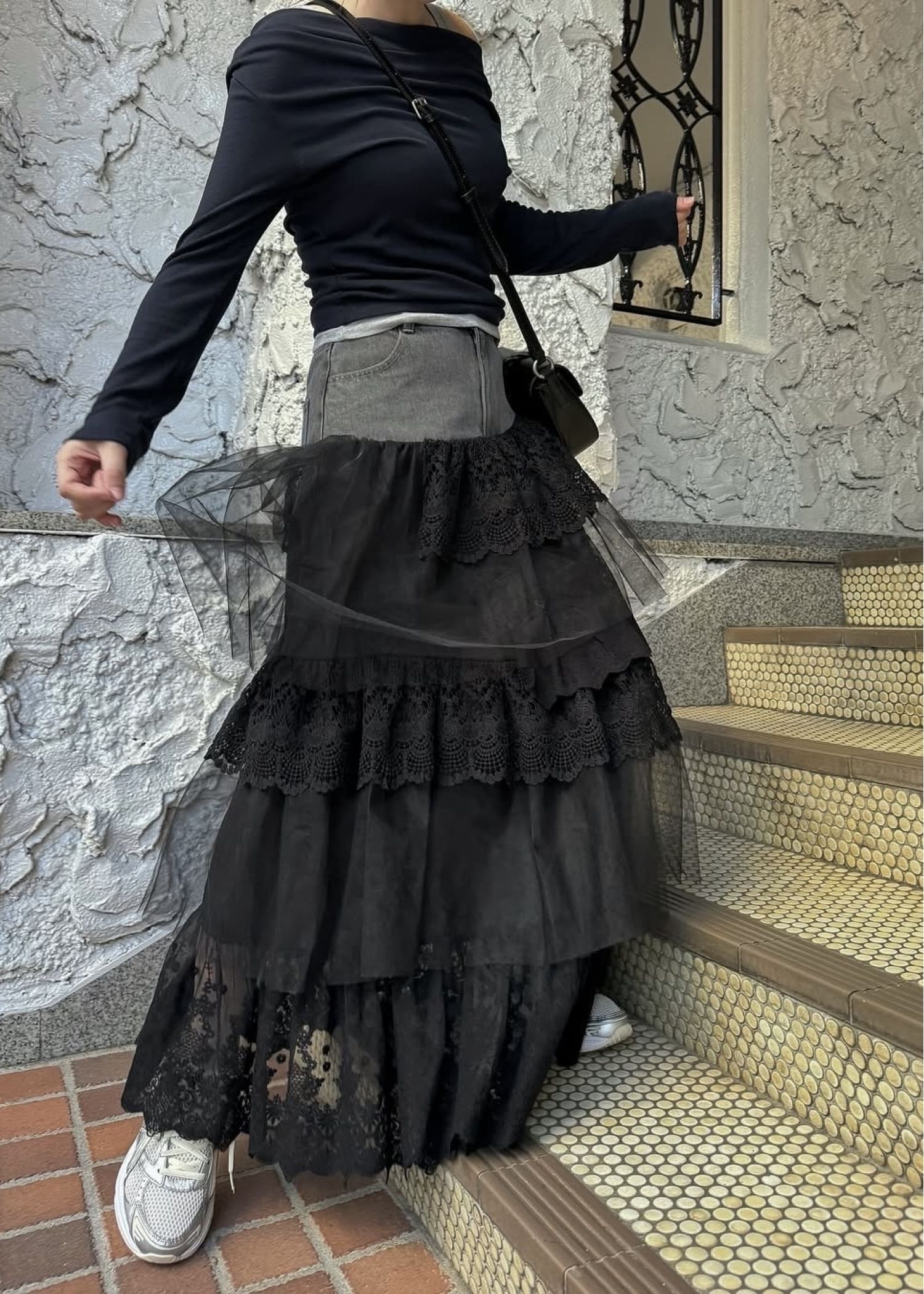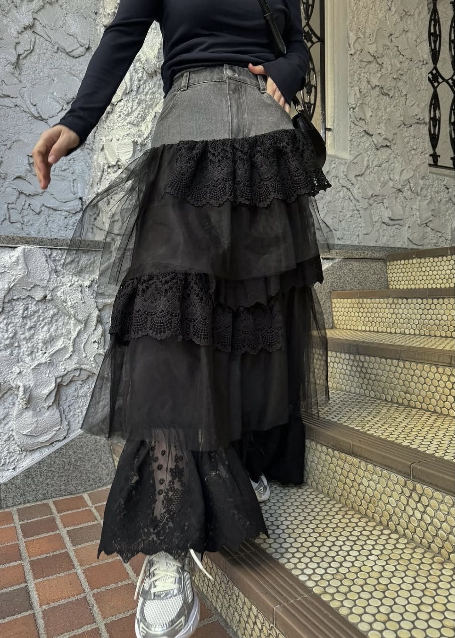 denim yoke lace irregular tiered SK