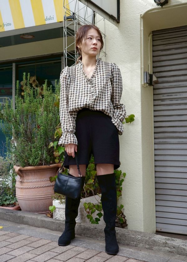 ・フリルデザインのチェックのブラウス