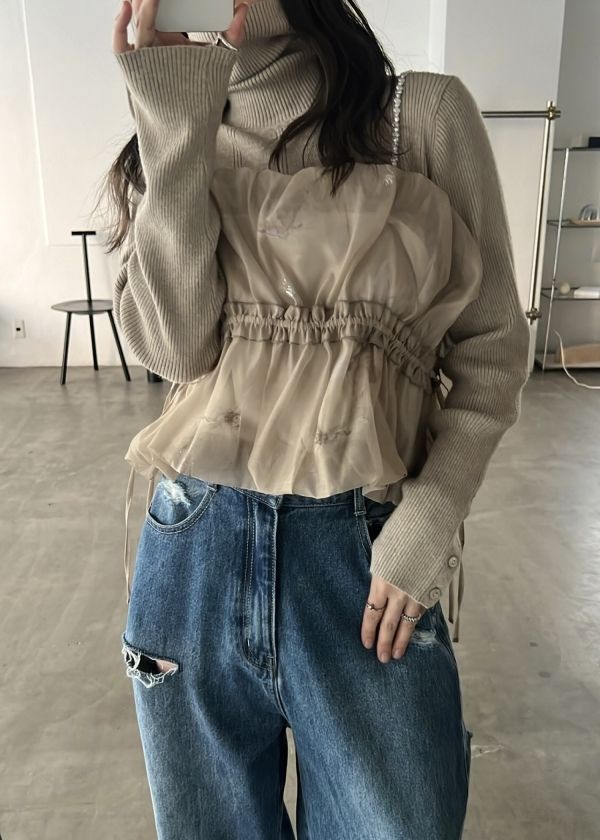 ・毎年人気の袖口にたっぷりと釦が付いたタートルニット