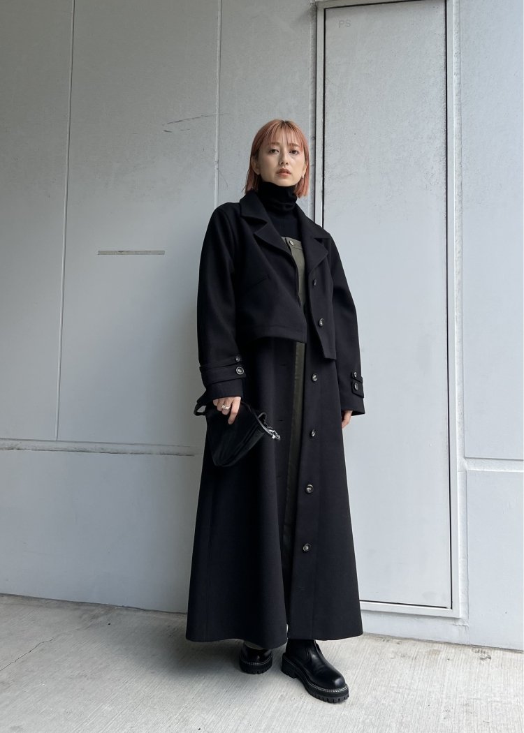 裾のボタンを外しブーツを覗かせるスタイリングもおすすめ