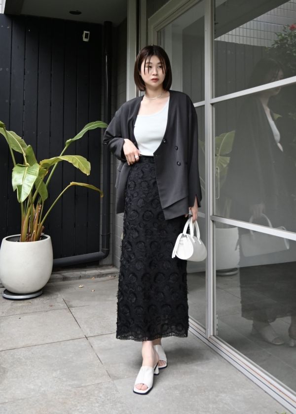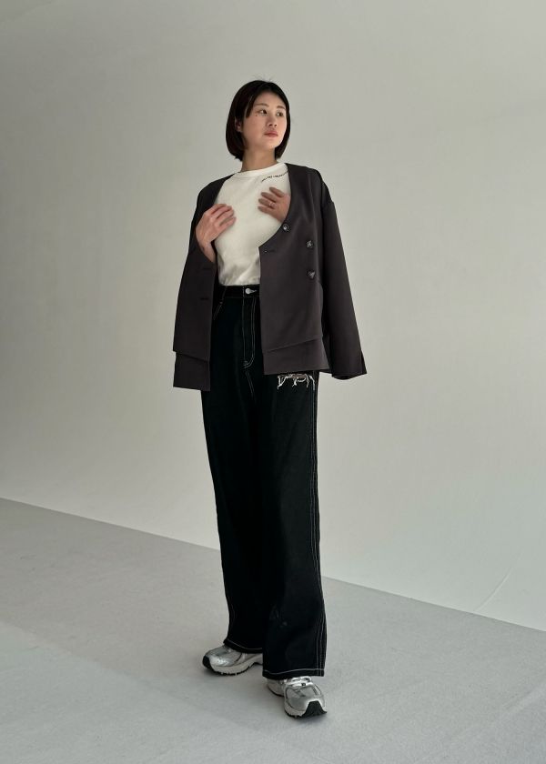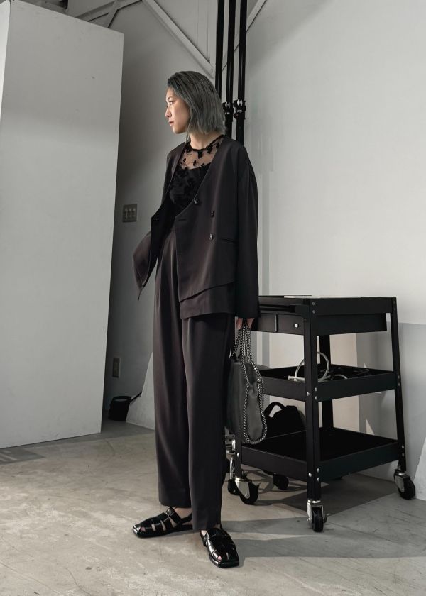 ・レイヤードデザインのノーカラージャケット