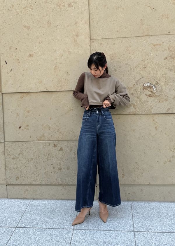 クロップド丈のトップスを合わせると旬なスタイリングに。