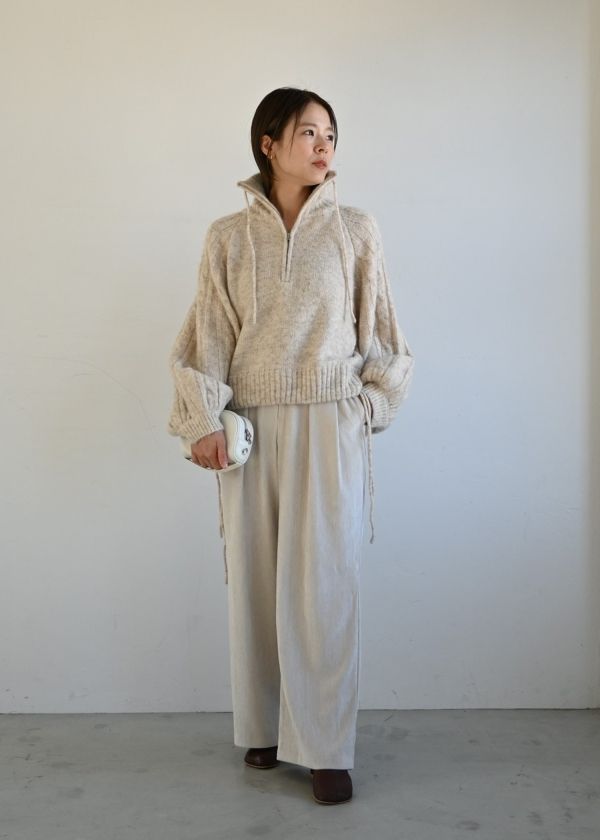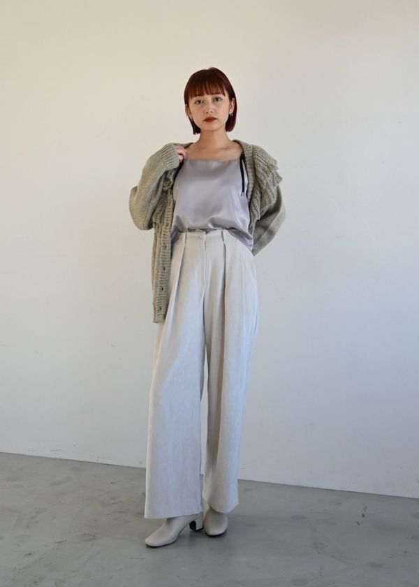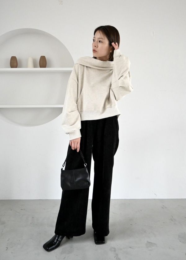 ・微光沢のある素材でニットやスウェット合わせも上品に