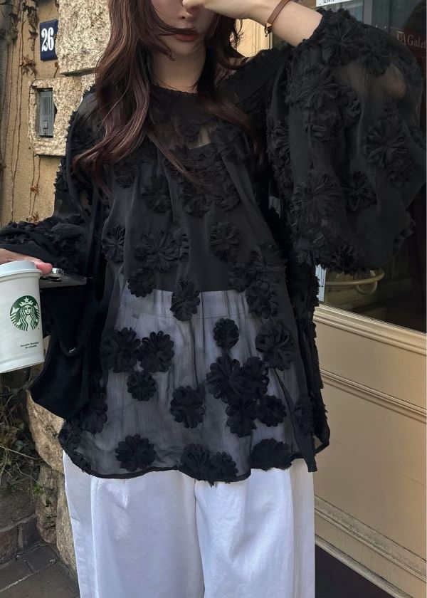 ・お花のモチーフがキャッチーなシアーブラウス
